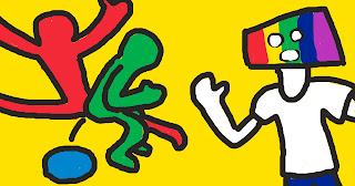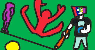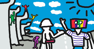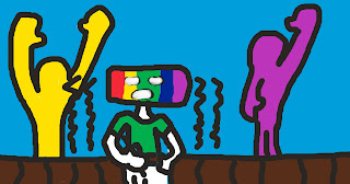 虹をまとう鏡の塔、カニの手を持つ男、虹に祈る女