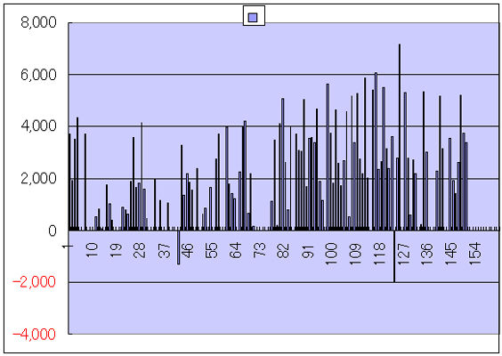 下のグラフは2014年10月20日から翌年3月19日にターンワールドの初稿が上がるまでの一日に書いた字数の棒グラフ。12月、つまり50辺りから一時間内で細かく休むようにした。だいたい5万字ぐらいで、ちょうどタクヤが異世界へ行ったところだ。一区切りついたので習慣を変えたのだろう。
