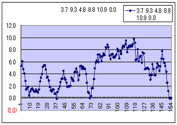 七日平均の線グラフ (分かりづらいが縦の値は400字を1としている。七日間の合計執筆字数/7/400で計算。右端は落ち込んでいるが執筆は横軸150ぐらいで終わっているので関係無し。73までの平均値は3.0。全執筆期間での平均値は4.8。横軸55あたりからグラフの変動が少なくなっているのがよく分かる。ちなみに真論君家の猫が平均6.9で、蒲生田岬が4.1。ヒッチハイクと高崎望は不注意でファイルを消してしまったが、その間ぐらいだろう。できればこれを10にまでもっていきたい。一度だけ10に届いているがこの時はむしろ一番楽に書けていたので、できないはずはない。書くこと自体はそれほどつらいことではないのだから。つらいのは書こうとして書けないときであって、これを如何に解消するのかが問題だと考えている。)